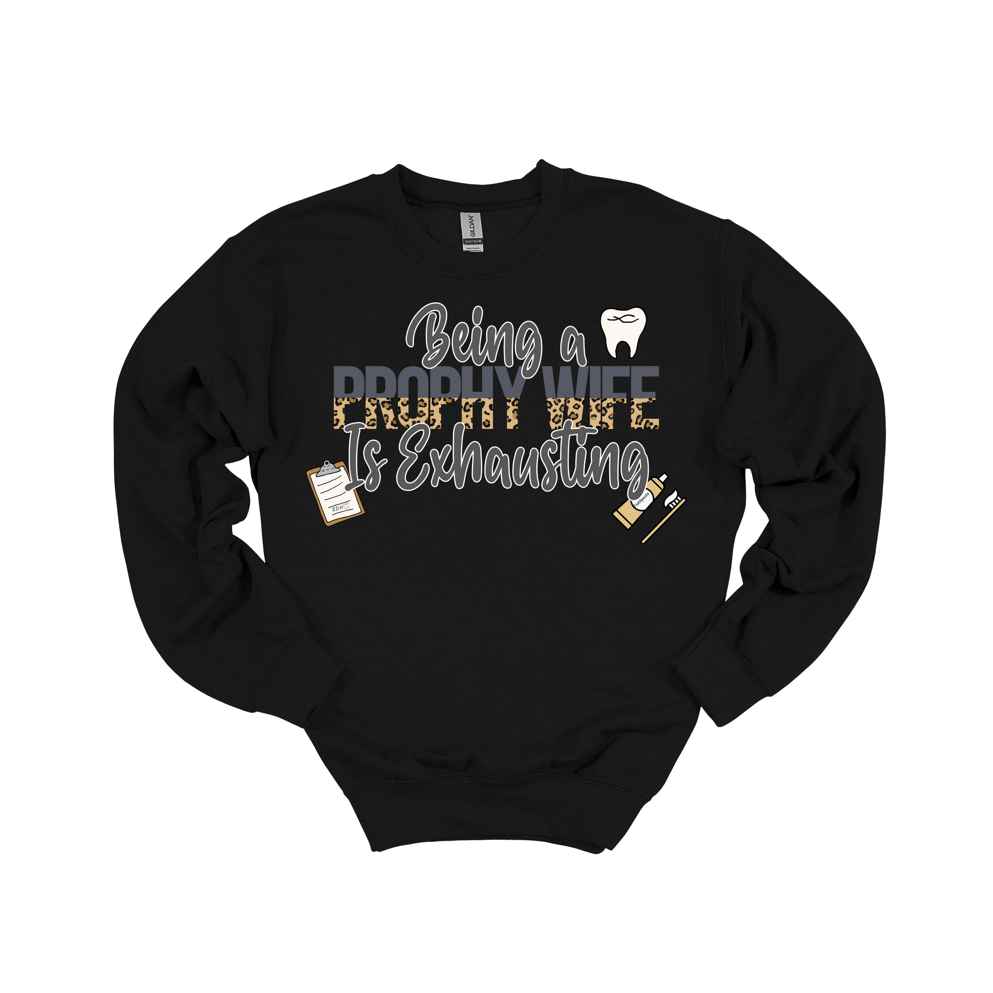 Embrace the hustle with our 'Being a Prophy Wife is Exhausting' sweatshirt or t-shirt. Perfect for dental hygienists, this comfy top is a playful nod to the hard-working lifestyle. Don't let the grind get you down, rock this quirky piece and show off your prophy pride! (But seriously, being a prophy wife is no joke.)